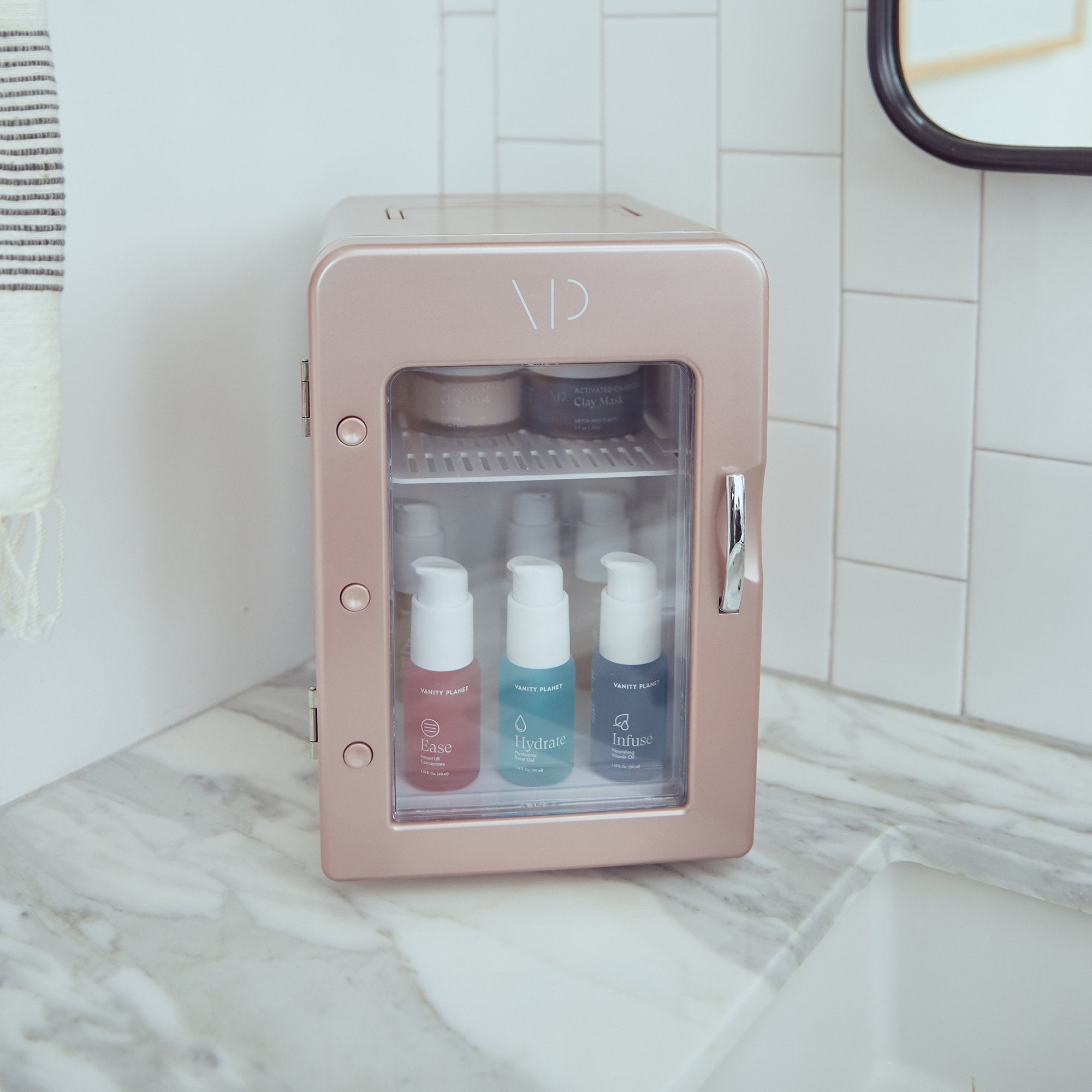 Our mini-fridge amplifies the potency of our entire range of clean beauty serums with an invigorating cloud-like cool—minimizing the need to use products with harmful, unnecessary preservatives. Eye-catching and compact, Fria stores your beauty favorites like a custom closet with interchangeable shelves and a clear window display.